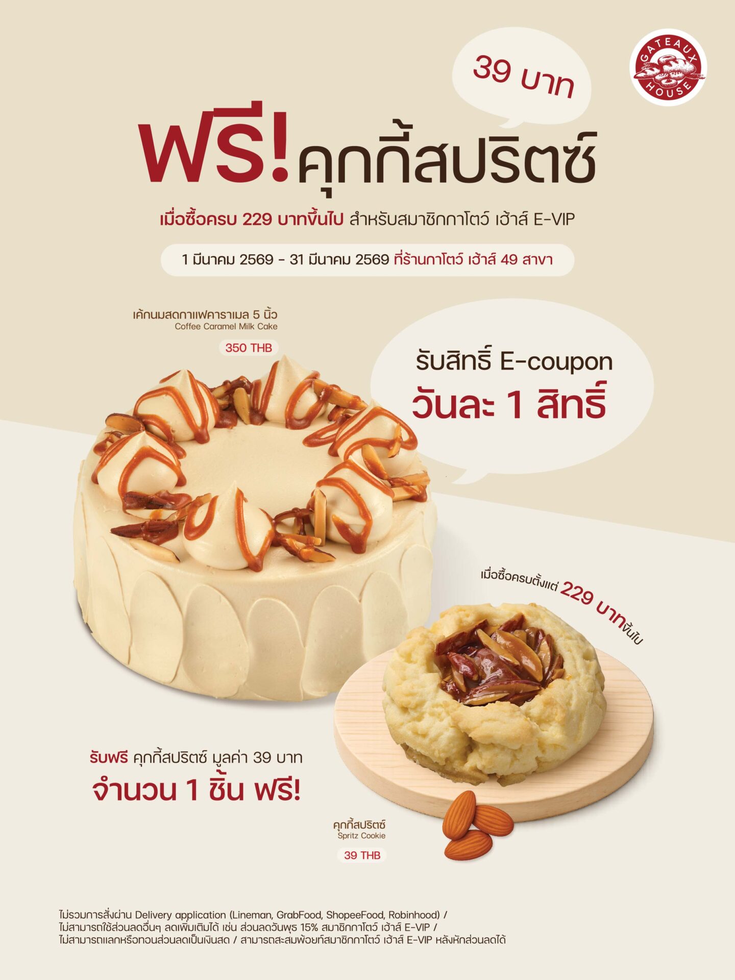 1. โปรโมชั่นซื้อครบ 229 บาทขึ้นไป รับฟรี คุกกี้สปริตซ์ 39 บาท ตั้งแต่ 1 มีนาคม 2569 – 31 มีนาคม 2569 ที่ร้านกาโตว์ เฮ้าส์ 49 สาขา ได้แก่ สาขา ดิโอลด์สยามพลาซ่า, แฟชั่นไอส์แลนด์, พหลโยธินเพลส, มาร์เก็ตวิลเลจ สุวรรณภูมิ, จามจุรีสแควร์, เมเจอร์ รัชโยธิน, ปั๊มบางจาก พระราม 2, เดอะมอลล์ งามวงศ์วาน, เดอะมอลล์ ท่าพระ, ปั๊มซัสโก้ วัดยายร่ม, เกตเวย์ แอท บางซื่อ, ปั๊มซัสโก้ ศรีนครินทร์, เซียร์ รังสิต,บิ๊กซี รัชดา, สะพานกรุงธน, เซ็นทรัล พระราม 2, แพลทตินั่ม,ปั๊มซัสโก้ วิภาวดี,เซ็นทรัล ปิ่นเกล้า, ปั๊มคาลเท็กซ์ คลอง 3, โลตัส บางใหญ่, เซ็นทรัล เวสต์เกต, บิ๊กซี สะพานควาย, ปตท.นครชัยศรี, ปั๊มซัสโก้ พุทธบูชา, เทอร์มินอล 21 พระราม 3, ท็อป ฟิวเจอร์พาร์ครังสิต, ซีคอน บางแค,เซ็นทรัล เวสต์วิลล์, เมกา บางนา, โรงพยาบาลตำรวจ, เซ็นทรัล บางนา, ปั๊มบางจาก กม.15 บางบัวทอง, ปั๊มบางจาก แคราย 1, ปั๊มบางจาก กาญจนาภิเษก กม.40, ปั๊มบางจาก กรุงเทพกรีฑา, ปั๊มบางจาก บางบอน 3, ปั๊มบางจากคู่ขนานรามอินทรา-เอกมัย 3, ปั๊มบางจาก ศาลายา, ปั๊มบางจาก ร่มเกล้า กม.9, ปั๊มบางจาก ศรีกรีฑา, ปั๊มบางจาก รังสิตคลอง 2, ปั๊มบางจาก วิภาวดีรังสิต 60, ปั๊มบางจาก วัดเจ้าอาม, เซ็นทรัล อีสวิลล์, อิมพีเรียล เวิลด์ สำโรง, วิคตอเรีย การ์เด้น, โรงพยาบาลนครธนและปั๊มบางจาก กาญจนาภิเษก บางบอน